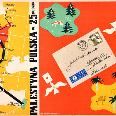 Original vintage LOT airline travel advertising poster - Palestyna Polska w 25 Godzin / Palestine Poland in 25 Hours - featuring a colourful design by Jerzy Skolimowski (1907-1985) and Andrzej Stypinski (1907-1975) depicting a route map between Europe and Palestine marking the cities of Helsinki, Tallinn, Riga, Vilnius, Gdansk, Berlin, Poznan, Katowice, Krakow, Warsaw, Lvyv, Cernauti, Bucharest, Sofia, Thessaloniki, Athens, Rodi, Tel-Aviv, Jerusalem and Cairo on a yellow background, with an image on the other side depicting two birds as air mail carrier pigeons flying with envelopes, a letter addressed to Warsaw Poland with a blue stamp on it - By LOT Air Mail - and Tel Aviv and Warsaw postmarks on the postage stamp set on a red background with two smaller illustrations of a cow grazing between trees on a green field above and a camel in the desert by palm trees and sand dunes below, the bold black title text running vertically in between the images and on the right border. The Polish poster designer Jerzy Skolimowski (1907-1985) was an Olympic rower as well as an architect and interior designer; he worked with the Polish graphic artist, designer and interior architect Andrzej Stypinski (1907-1975) in the 1930s. Founded in 1929, LOT Polish Airlines / Polskie Linie Lotnicze LOT is the flag carrier of Poland and one of the world's oldest airlines; the company introduced airmail services in 1929. Very good condition, light creasing, small tears and minor staining.