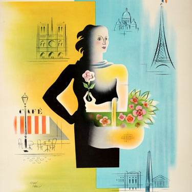 Original vintage travel poster - To Paris Pan American World's Most Experienced Airline - featuring a colourful design by Jean Carlu (1900-1997) depicting a lady holding a basket of flowers and a rose in her hand with illustrations of seating outside a cafe and famous historical monuments in the background including the Eiffel Tower flying a French flag at the top, the Notre Dame cathedral, Cleopatra's Needle on the Place de la Concorde and the Sacre Coeur Basilica against a blue and yellow background with the bold text next to a plane flying above and in black below with the PanAm logo leading to a stylised plane on the dividing line. Printed in the USA. Good condition, restored tears on edges, small restored paper losses, minor staining, browning, backed on linen.