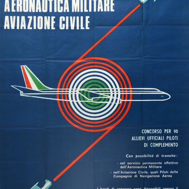 Original vintage recruitment poster for the Italian Air Force and for civil aviation - Piloti per Aeronautica Aviazione Civile - featuring a great graphic design showing a white outline of a commercial passenger jet plane flying in front of a bull's eye target formed by the vapour trails of two military aircraft fighter planes, the tail and lines in the green white and red colours of the Italian flag set against a dark blue background, with the bold title text in white above and information text below detailing a competition to recruit 90 additional pilot officer students with the possibility of transfers to permanent positions in the military air force or for commercial airlines with the date 30 April 1968. Large size. Good condition, folds, creasing.