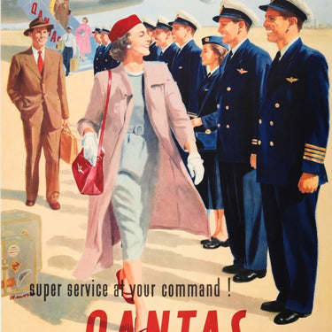 Original vintage travel advertising poster for Qantas super service at your command! Australia's international airline Qantas Empire Airways Ltd in association with British Overseas Airways Corporation BOAC and Tasman Empire Airways Ltd. Great mid century illustration featuring a smartly dressed smiling lady walking past a line of Qantas cabin crew wearing blue uniform with suitcases bearing luggage labels on the side, a man in a brown suit and hat following her and more passengers disembarking a Qantas Lockheed Constellation plane with an Australian flag and winged kangaroo design on the tail in the background, the stylised lettering below. Founded in 1920, Qantas (Queensland and Northern Territory Aerial Services Ltd aka "The Flying Kangaroo") is the national flag carrier of Australia; the airline started international flights in 1935 and is one of the oldest airline companies in the world. Excellent condition, backed on linen.