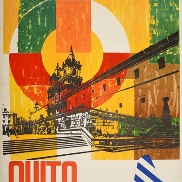 Original vintage travel poster for Quito Ecuatoriana / Ecuador featuring a colourful design depicting the 16th century Church and Convent of St. Francis complex / Iglesia y Convento de San Francisco and historic Plaza San Francisco public square set against brightly painted shapes with the title text and plane below. Quito is the capital of Ecuador and is located high in the Andes mountain foothills close to the equator in South America on the foundations of an ancient Inca city; its historic centre is one of the largest and best preserved in the Americas and was declared a UNESCO World Heritage Site in 1978. Good condition, restored tears, light stains, backed on linen.
