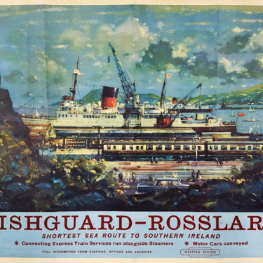 Original vintage travel poster - Fishguard Rosslare Shortest sea route to southern Ireland - featuring a great painting of Fishguard Harbour depicting a steamship flying a red ensign flag moored by the railway station busy with people walking on the platform by the train carriages and walking along a fenced pavement with a car parked on the road, the view framed by a cliff side and trees in the foreground, another ship and sailing boats at sea in front of the hills in the distance, the text below on a blue banner with the information - Connecting express train services run alongside steamers Motor cars conveyed - and British Railways Western Region logo. The coastal town of Fishguard is located in Pembrokeshire Wales and the seaside village of Rosslare serves the ferry traffic from the UK and Europe. Printed by Haycock Press Ltd London. Horizontal. Large size. Good condition, several restored paper losses, several restored tears through image, restored creasing, restored folds, staining, backed on linen.