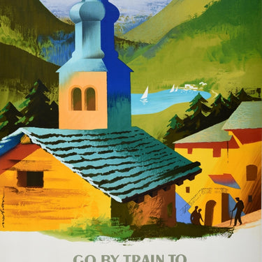 Original vintage railway travel poster - Go by Train to The French Alps - featuring a scenic view by Jacques Nathan Garamond (1910-2001) showing a hiker and people walking by a church in a village in the foreground with trees and green hills leading over sailing boats on a calm lake to snow topped mountains below the blue sky on the horizon, the text on the margin below. Issued by French Railways. Very good condition, repaired tears, restored pinholes, minor staining, backed on linen.