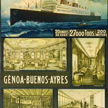 Original vintage cruise travel poster - Giulio Cesare Genoa Buenos Ayres Navigazione Generale Italiana - featuring an image of the ocean liner at sea above smaller views showing the Classe de Luxe / luxury class life on board the SS Giulio Cesare (launched 1920) including The Entertainment Salon with comfortable sofas and chairs and paintings on the panelled walls, The Gallery with windows to enjoy the sea view, Smokers Cafe Lounge and Verandah Promenade depicting people walking along the covered walkway, a gentleman looking out over the ocean and a lady relaxing on a deck chair, with the bold text between the images and details on the steam ship - 20 knots an hour 27000 tons 200 metres - and the bold title lettering in red at the top. The SS Giulio Cesare provided first, second and tourist class passenger services on the Italy to South America route for the Italian shipping company Navigazione Generale Italiana NGI; from her maiden voyage in 1922 until 1925 she was one of the largest ships in the Italian merchant fleet with the SS Duilio; she became part of the Italian Line from 1932 until 1942; she was then used by the International Red Cross during World War Two and was sunk by an Allied air attack in 1944 while she was out of use in the port in Trieste. Good condition, restored folds, restored creasing, restored tears, restored paper loss, foxing, backed on linen.