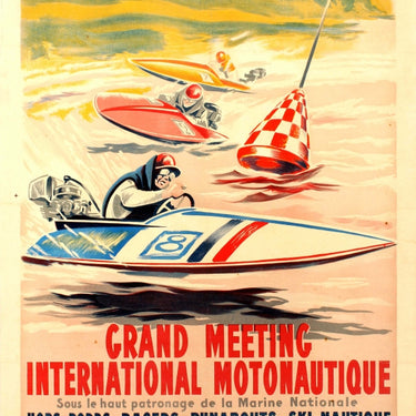 Original vintage water sport poster for the Grand Meeting International Motonautique held on 12 and 13 June 1948 at the Bassin Du Trocadero featuring a dynamic illustration by Geo Ham (Georges Hamel; 1900-1972) of speed boats racing around a chequered buoy with a race flag blowing in the wind. Founded in 1922 in Belgium as the Union Internationale du Yachting Automobile, the Union Internationale Motonautique (UIM; since 1927) is the international governing body of power boating based in the Principality of Monaco. Large size. Good condition, creases, folds, stains, backed on linen.