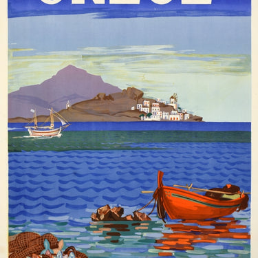 Original vintage travel poster - Greece Aegean Sea Coastline / Grece Littoral de la mer egee - featuring a colourful seaside view depicting a wooden rowing boat moored to a rock and reflected on the water near fishing nets and a basket of fish on the stony beach in the foreground, a tall ship sailing in front of traditional white buildings in a rocky seaside town and hills in the background, the bold title text in white against the blue background above and rest of the text below. Issued by the General Secretary of Tourism in Athens. Good condition, restored punched holes on top edge, restored paper skimming, minor staining, backed on linen.