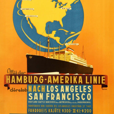 Original vintage travel poster advertising Hamburg America Line cruises direct to Los Angeles San Francisco featuring a sleek ocean liner ship sailing at sea in front of a globe of the world marked with New York and the city names on the route over the map of Canada and America to the Panama Canal - Vancouver Seattle Portland San Francisco Los Angeles Cristobal - set against a bright background with the title text on a deep ribbon and blue information box reading - Mit der Hamburg Amerika Linie direkt nach Los Angeles San Francisco Portland Seattle Vancouver uber Antwerpen durch den Panama Kanal - with the prices and details of the 27 day trip above the HAPAG logo on the side. Artwork by the German painter and graphic artist Ottomar Anton (1895-1976). Very good condition, minor creasing, minor staining, backed on Japanese paper.