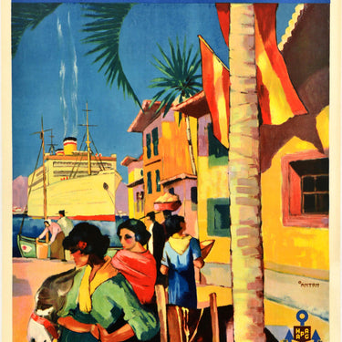 Original vintage cruise ship travel poster advertising Atlantic island tours on the pleasure steamer Oceana with the Hamburg America Steamship Company from 10 September to 5 October 1930 - Atlantische Inselfahrt mit dem Vergnugungsreisen-Dampfer Oceana Hamburg-Amerika Linie - featuring colourful artwork by the German painter and poster artist Ottomar Anton (1895-1976) showing ladies with a donkey next to a palm tree in front of a building and people next to a wooden boat, the steam ship moored at sea in the background and the bold text in yellow on blue banners above and below. Printed by Habuva Dorschel and v. Witzleben Hannover. Good condition, restored tears, restored folds, backed on linen.