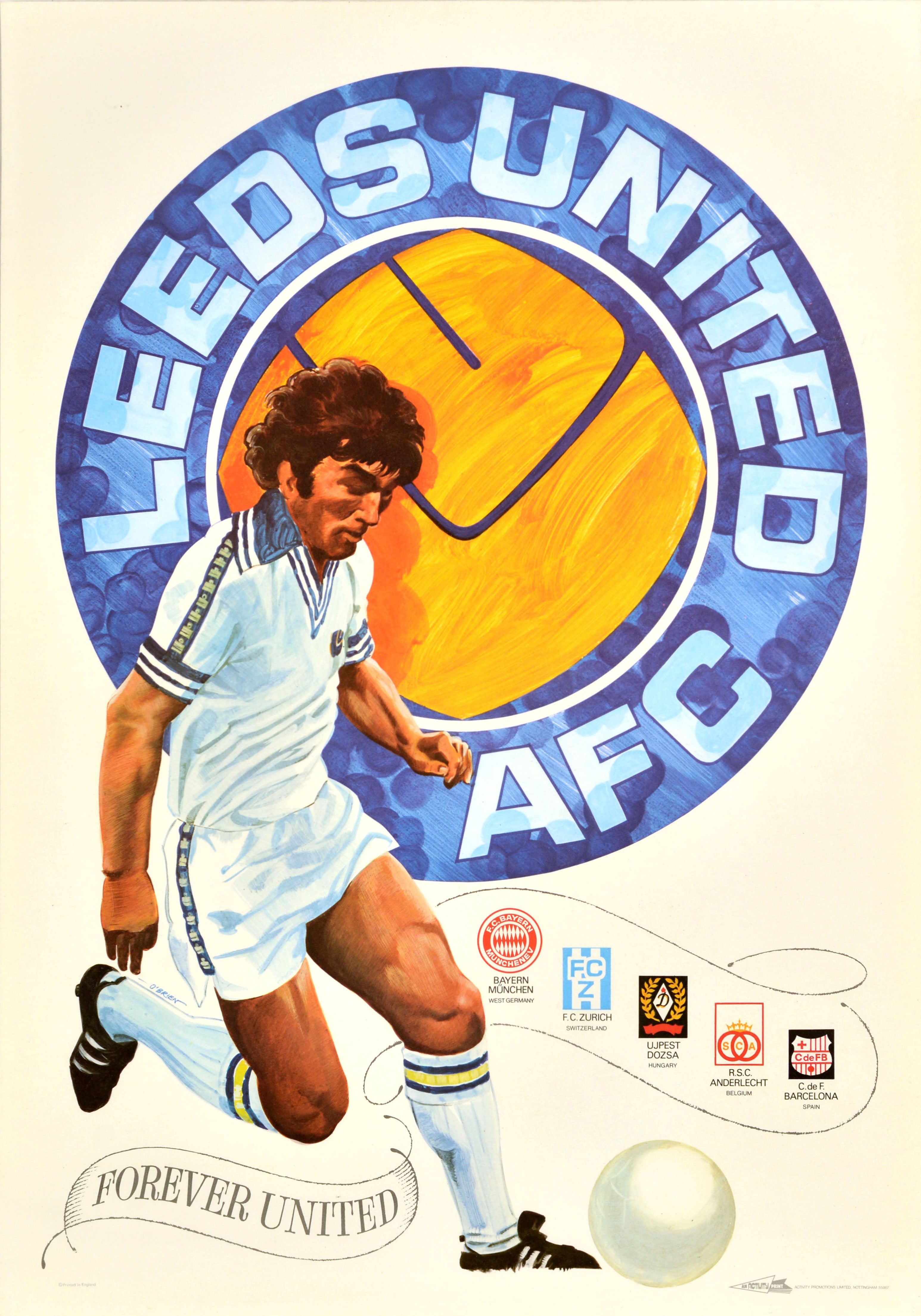 Original vintage sports poster celebrating Leeds United's triumphant journey to the 1975 European Cup Final featuring a dynamic illustration of a Leeds player in action with a football (possibly Peter Lorimer), in front of the Club's 1973 blue and yellow L U smiley badge logo - Leeds United AFC - and the slogan Forever United on a ribbon below, along with the shields of the teams Leeds defeated on their path to the final in Paris including Bayern Munich West Germany, FC Zurich Switzerland, Ujpesti Dozsa Hungary, RSC Anderlecht Belgium and C de F Barcelona Spain. Printed by Activity Promotions Limited Nottingham. Excellent condition.