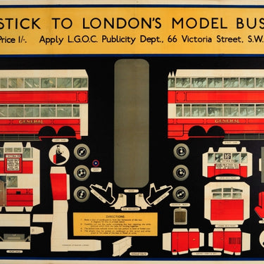 Original vintage advertising poster promoting London Transport with images including the conductor and driver with the axle, bonnet and other sections of a 16A bus to Victoria and instructions on how to make a model of the iconic red London General double decker bus: Stick to London's Model Bus Price 1/- Apply LGOC (the London General Omnibus Company; 1855-1933) Publicity Department, 66 Victoria Street SW1 to receive your own poster cut out with directions to stick the poster onto a cardboard box and cut out the images, gluing them together to create your very own London bus. Designed by the English artist and poster designer Frank Mason (Frank Henry Algernon Mason; 1875-1965) and printed by The Dangerfield Printing Co. Large size. Horizontal. Good condition, restored folds, small restored paper losses, staining, backed on linen.
