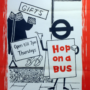 Original vintage advertising poster featuring a fun image of a sandwich style billboard with a London Transport logo pointing to a message on it - Hop on a Bus - in front of a shop. One of a series of posters promoting London's convenient bus service. Printed by Leonard Ripley & Co Ltd. Excellent condition.