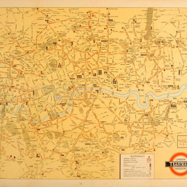 Original vintage travel map of London Tramways Transport designed by Lt Colonel W.R. Mansfield and published by London Passenger Transport Board in October 1934. Colourful map indicating a schematic and detailed design of the tramway and trolleybus routes across London from Hampton Court and Uxbridge in the west and clockwise to Barnet, Epping Forest, Dagenham, Dartford, Purley and Sutton, with the London Underground stations and the main line railway stations marked and the River Thames running along the centre, the London Transport Tramways logo and reference box at the bottom right. Horizontal. Good condition, folds, pinholes, minor tears and stains in the margins, backed on linen.