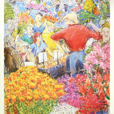 Original vintage London Underground poster - The Flower Market by Tube Sunday mornings at Columbia Road Shoreditch nearest stations Old Street, Shoreditch - featuring a colourful floral image showing a flower seller with people at the market and various flowers in the foreground, the text and London Underground logo at the top. Columbia Road Flower Market by Kay Gallwey one of a series commissioned by London Underground. Large size. Very good condition, minor creasing, small tears.