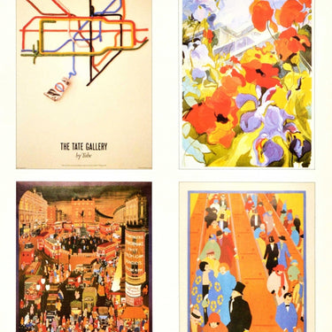 Original vintage London Underground poster - The Tube Gallery Many posters available at the London Transport Museum Covent Garden Nearest stations: Covent Garden and Leicester Square - featuring four posters for the Underground: The Tate Gallery by Tube depicting the colourful tube map lines as paint from a tube marked with the London Underground logo; The New Kew by Tube with floral artwork; a busy street scene at night with people, buses and classic cars at Piccadilly Circus with a theatre sign in the foreground; and the iconic Brightest London is best reached by London Underground poster design (issued in 1924) depicting smartly dressed people in fashionable clothing and top hats travelling on an escalator. Good condition, minor creasing, staining.