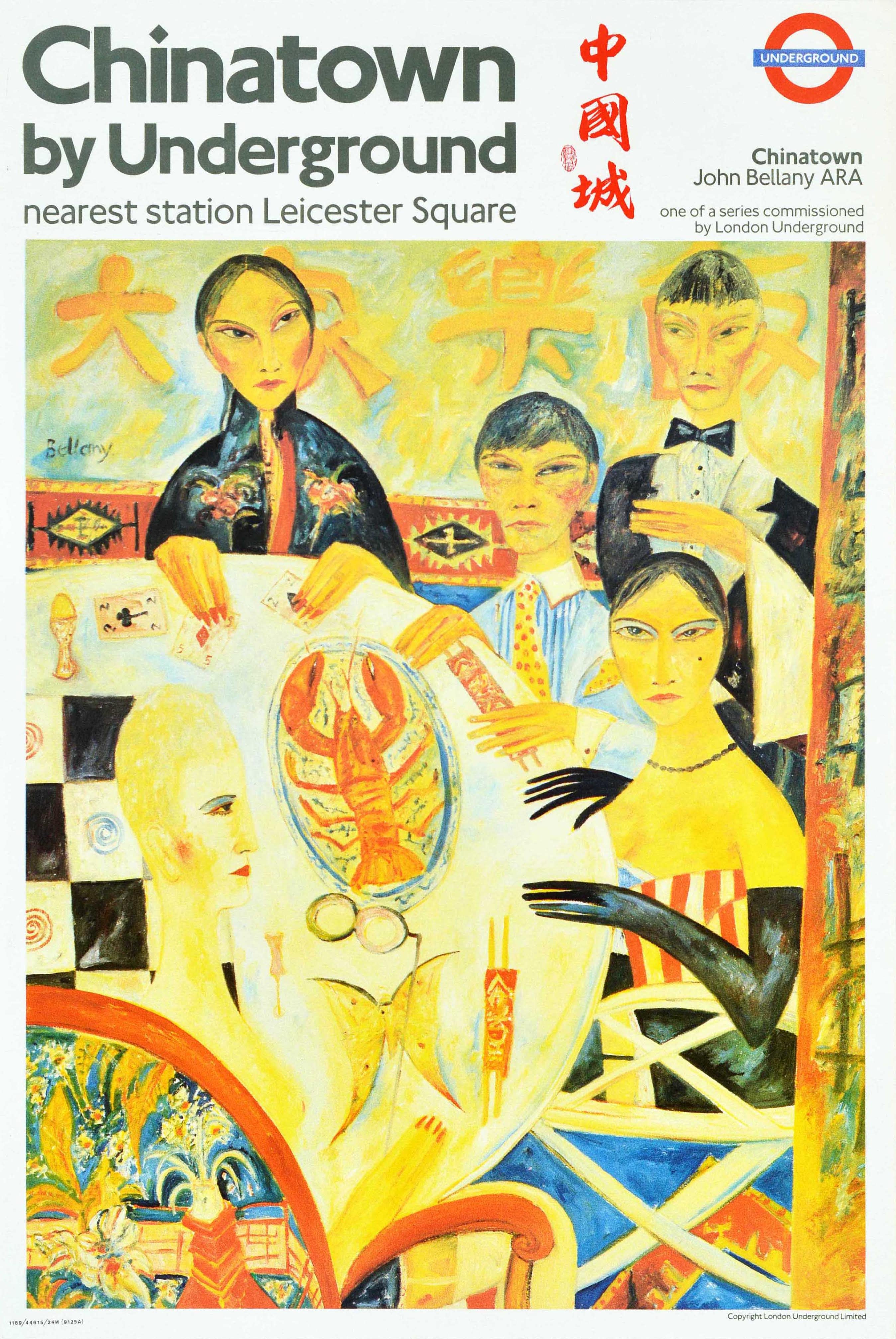 Original vintage London Underground poster for Chinatown by Underground nearest station Leicester Square featuring a colourful image of a waiter and people eating at a Chinese restaurant in Chinatown with food and games on the table including playing cards and a checkers / draughts board, chopsticks and a lobster on a plate, the text also in Chinese characters at the top. Chinatown John Bellany (1942-2013) one of a series commissioned by London Underground. Excellent condition, light creasing.