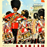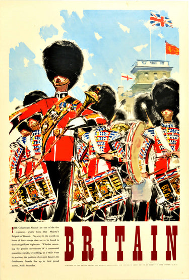 Original vintage travel poster for Britain featuring a colourful image of The Coldstream Guards in full uniform marching towards the viewer in a ceremonial parade playing music on drums in front of a building flying the Union Jack, Royal and English flags against the blue sky background with the bold red lettering and information text below - The Coldstream Guards are one of the five regiments which form Her Majesty's Brigade of Guards. No army in the world can boast of finer troops than are to be found in these magnificent regiments... Artwork by the French artist Albert Brenet (1903-2005). Good condition, stain on top margin, light creasing, tears on edges.