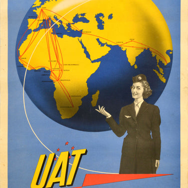 Original vintage travel advertising poster - UAT Aeromaritime dans touls les ciels d'Afrique et d'Orient / in all the skies of Africa and the Orient - featuring a striking design depicting a black and white photograph of an air stewardess in a smart uniform pointing to a route map on a globe of the world in yellow and blue with the airline routes marked in red and a photo of a propeller plane flying above, the title in bold letters with red stars below. Based in Paris the French company Union Aeromaritime de Transport UAT was founded in 1949; it merged with Transports Aeriens Intercontinentaux TAI to form Union de Transports Aeriens UTA in 1963. Good condition, creasing, tears, pinholes, staining.