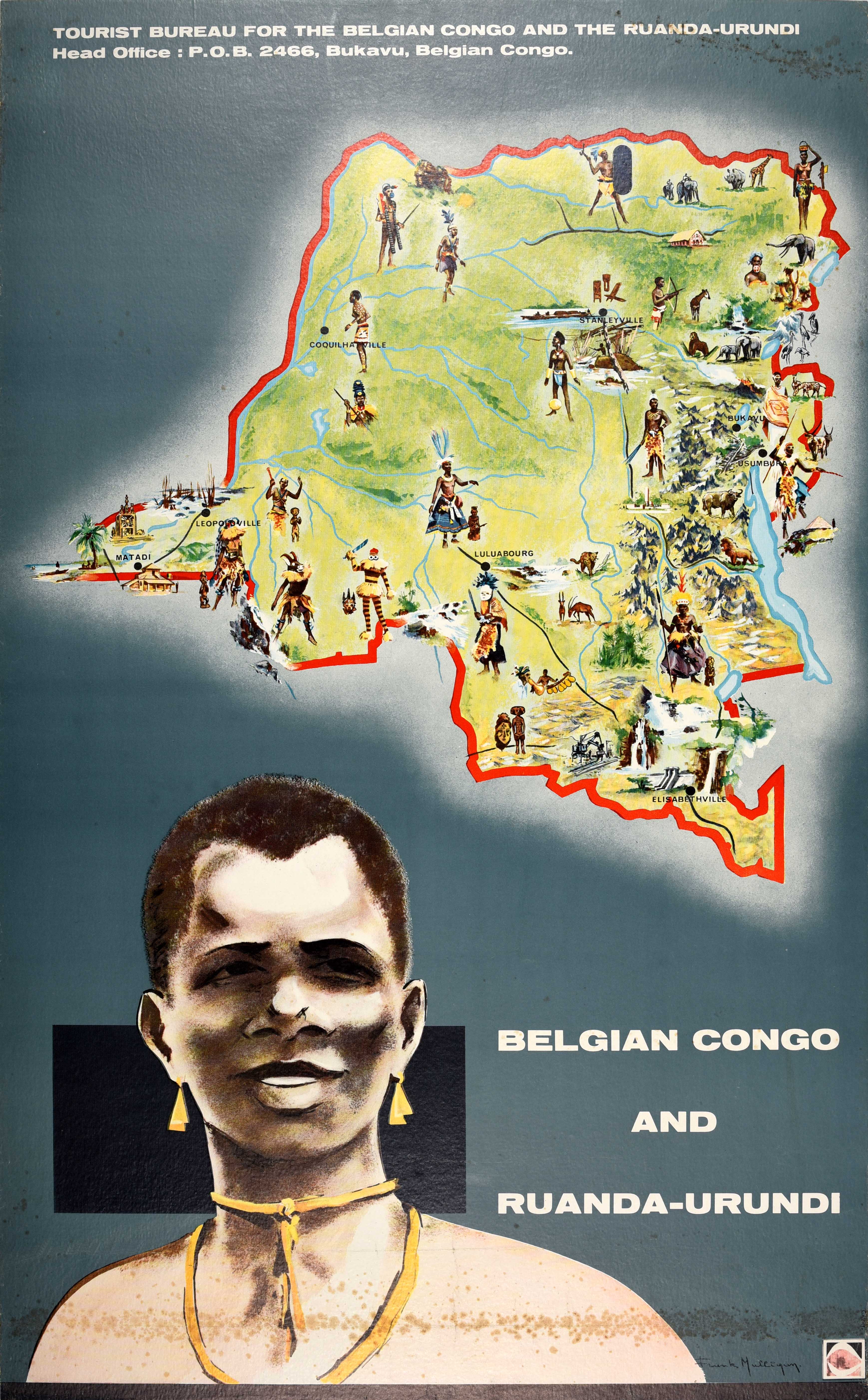 Original vintage Africa travel poster for the Belgian Congo and Ruanda-Urundi featuring a pictorial map of the area with colourful illustrations of people in traditional tribal wear and masks, some holding spears and shields, tools and musical instruments, various wild animals including elephants, giraffes, rhinos, zebras, buffalo, birds, lions and antelopes, as well as industry, towns and natural rivers, lakes and mountains marked on the landscape with an image of a smiling person next to the title text below and the information above - Tourist Bureau for the Belgian Congo and the Ruanda-Urundi Head Office POB 2466 Bukavu Belgian Congo. The Belgian Congo was owned by King Leopold II before it was taken over as a Belgian colony from 1908 until independence in 1960, becoming the Republic of the Congo Leopoldville; renamed the Democratic Republic of the Congo DRC in 1964. The smaller territory of Ruanda-Urundi was a German colony that was occupied by Belgium during World War One; it became a separate mandate territory under the League of Nations from 1922 then the independent nations of Rwanda and Burundi in 1962. Fair condition, restored creasing, restored folds, restored tears, staining foxing on the bottom, backed on linen.