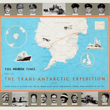 Original vintage advertising poster - The Times Map of the Trans-Antarctic Expedition 1957-1958 Feature articles by Dr Vivian Fuchs and Sir Edmund Hillary on the Trans-Antarctic crossing appear exclusively in The Times. Great design featuring a map of Antarctica marking the South Pole in the centre of the historic expedition route line between Shackleton Base and Scott Base - the first overland crossing of Antarctica via the South Pole that was led by the explorer Dr Vivian Fuchs (1908-1999) and the mountaineer and explorer Sir Edmund Hillary (1919-2008) - with black and white images of the supporting planes above and ships at sea (the Endeavour and the Magga Dan), The Times newspaper logo and text below, surrounded with a border of black and white photos and names of the Commonwealth expedition team members and photos of a Muskeg tractor, Sno-Cat and Weasel vehicles. Stylised lettering on the bottom of poster. Horizontal. Very good condition, minor restored tears on folds, backed on linen.