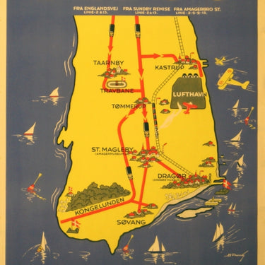 Rare original vintage travel poster issued by the Tourist Office of Amager, Denmark. Amager is now part of Copenhagen and home to its international airport. This poster features the airport as well but with a grass airfield and bi-planes ready for landing, there is even a jetty for the water planes to dock after landing. Printed by R. Lindengaard, Copenhagen, most likely in the 1920s as Amager was extended in the early 1930s by extensive land reclamation on the West of the peninsula. The poster is in very good condition with minor repaired tears on the margins.