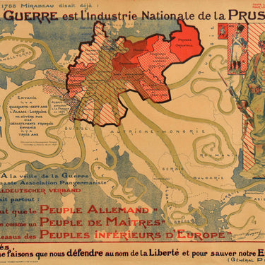 Original antique French propaganda poster featuring a quote by Mirabeau at the top - La Guerre est l'Industrie Nationale de la Prusse / War is the national industry of Prussia - with images of soldiers on the right dated 1715, 1815 and 1914 illustrating the growth of the German military over two centuries, the main image showing a map of Europe with colour coding highlighting the country’s territorial expansion and depicting Germany as an octopus with its tentacles extending in all directions towards France, England, Spain, Italy, the Balkans, Greece, Turkey and Asia Minor, Romania and Russia with dates of battles and captions including - Invaded 47 years ago, Alsace-Lorraine is no different from the French departments invaded three years ago - and on the left in bold blue and red lettering below - German proclamation On the eve of war the German people must rise up as a people of masters over the inferior peoples of Europe - and an urgent call to action in red text above - All of France stands up for the victory of right - and a quote by Petain at the bottom - Attaques, Nous ne faisons que nous defendre au nom de la Liberte et pour Sauver notre Existence / Attacked, We are only defending ourselves in the name of Freedom and to Save our Existence (General Petain June 1917) - a wreath on the corner - La Conference au Village contre la Propagande Ennemie en France 11 Avenue de l'Opera Paris. The French writer and statesman Honore Gabriel Riqueti, Count of Mirabeau (1749-1791) was a member of the Jacobin Club and was regarded as the father of the French Revolution (1789-1799); he was posthumously disgraced in 1792. The French General Henri Philippe Benoni Omer Joseph Petain (1856-1951) served as Chief of Staff of the Army in 1917, having reached the rank of Colonel during World War One leading the victory in the 1916 Battle of Verdun (after which he became known as "Le lion de Verdun"); he became Prime Minister of France in 1940 and Chief of the French State in 1994; after World War Two he was tried and convicted for treason and sentenced to life in prison. Printed by P.J. Gallais et Cie. edit. imp. Paris (Atelier Maurice Neumont). Horizontal. Good condition, creasing, small tears, minor staining.