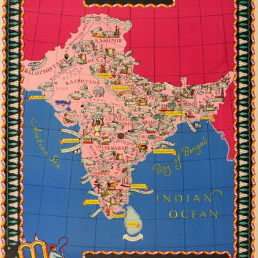 Original vintage World War Two pictorial map for India In War And Peace featuring colourful illustrations of people, animals, factories, cattle, products and points of interest including silk, petroleum, wheat, tobacco, cotton, rice, silver, farming, ship building and tea with a traditional style image of an Indian man on an elephant in the lower left corner next to the description box - Before the war India was already one of the eight leading industrial countries of the world. Indian capital and Indian technical skill have helped to develop still further the country's industries since war began... - surrounded by a decorative flower border. Very good condition, light folds, restored small tears on folds, backed on linen.