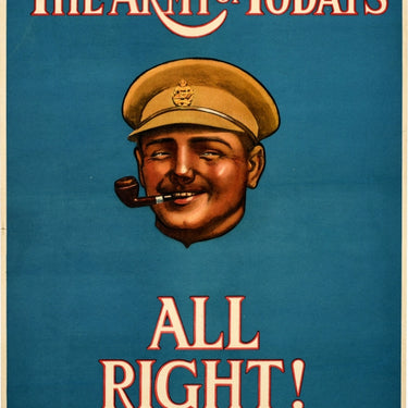 Original antique military recruitment poster - The Army of Today's All Right! - featuring a great design of a smiling soldier smoking a pipe on a blue background with the stylised bold white and red lettering above and below. Excellent condition, backed on linen.