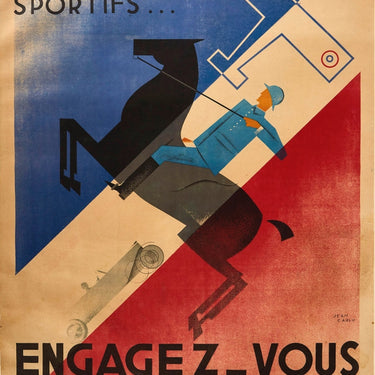 Original vintage military recruitment poster published by the French Ministry of War Republique Francais Ministere de la Guerre - Jeunes Gens Sportifs Engagez-vous dans l'Armee Francaise / Young Sporty People Join the French Army - featuring a dynamic Art Deco design by Jean Carlu (Jean Georges Carlu; 1900-1997) featuring an image of a soldier in uniform riding a horse diagonally between a classic car and stylised image of a plane against a red, white and blue background representing the French flag with the bold black and blue text above and below. Large size. Good condition, staining, restored tears, backed on linen.