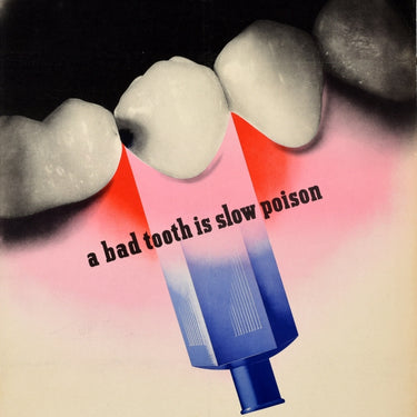 Original vintage World War Two military health poster - A bad tooth is slow poison Visit your Dental Officer regularly - featuring a great design by the notable British graphic designer Abram Games (Abraham Gamse; 1914-1996) depicting a black and white image of teeth with a blue glass poison bottle dripping from one decaying tooth radiating the pain in red, the text diagonally in black and in bold red letters below. Good condition, restored folds, restored tears on image, staining, writing on reverse visible, backed on linen.