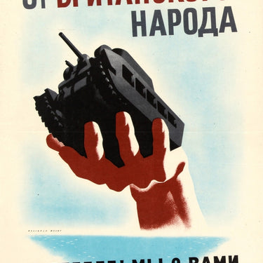 Original vintage rare World War Two propaganda poster - "From the British people Towards Victory! We are with you" - No 3 of the British Artists series distributed in the USSR as part of the 1941-1945 lend lease Anglo-Soviet military aid programme featuring dynamic artwork by the British poster designer Reginald Mount (1906-1979) showing a hand holding up a military tank over sea to symbolise it being given to the Soviet army with the stylised text above and below in grey, red and black letters with a Union Jack flag inside an eye logo. Good condition, folded as issued, minor tears and creases in left margin.