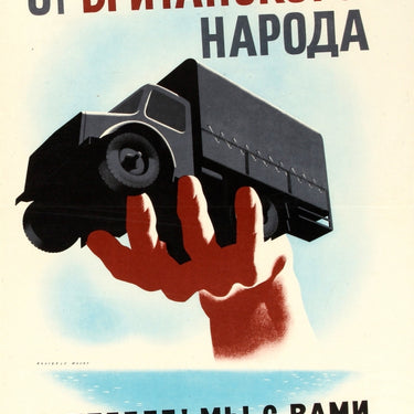 Original vintage rare World War Two propaganda poster - "From the British people Towards Victory! We are with you" - No 2 of the British Artists series distributed in the USSR as part of the 1941-1945 lend lease Anglo-Soviet military aid programme featuring dynamic artwork by the British poster designer Reginald Mount (1906-1979) showing a hand holding up a military truck over sea to symbolise it being given to the Soviet army with the stylised text above and below in grey, red and black letters with a Union Jack flag inside an eye logo. Good condition, folded as issued, faint creases.