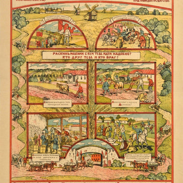 Original antique Soviet propaganda poster - Give bread to the revolution! Peasant! Your harvest has been harvested for a long time, have you calculated the surplus? How do you plan to dispose of it? Think about it comrade: before you are two states: the Soviet Workers' and Peasants' Republic and Denikin's Landlord-General Kingdom. Think about who you should go with? Who is your friend and who is your enemy? Colourful design featuring a countryside view with windmills, trees and farms and horse drawn carts laden with produce walking along paths leading down each side to the entrance of a walled city below, the text in stylised lettering with illustrations showing the difference of life under the communist Red Army on the left and under the White Army on the right, depicting the peasant farmers working on the land under the Russian military leader Anton Denikin (1872-1947) beating them and taking the products of their labour compared to the Soviet state flying red Soviet flags and paying them fairly for the work, the captions reading - The Soviet government gave you the landowner's land. What to do with Denikin's land? The Soviet government pays for bread in money and goods. The generals and constables will collect the landowner's losses from you, take an indemnity and pay with whips - and the text below - Hand over your bread to the Workers' and Peasants' government, comrade! Hurry to the collection points! Your bread is necessary for the Red Army which, enduring thousands of hardships, defends your freedom and lands. Your bread will feed the workers who, exhausted, prepare products for the Red Army, the city and the countryside. It is also necessary for the peasants of the hungry provinces. Hurry up, comrade! Remember, the Tsarist generals, merchants and landowners will get their bread if you don't support the Red Army and the workers! Published by the State Publishing House, Moscow. Good condition, creasing, tears, small paper losses on edges, minor staining, printing errors.