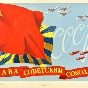 Original vintage Soviet aviation propaganda poster - Слава Советским Соколам! / Glory to the Soviet Falcons - featuring a dynamic military illustration of the red hammer and sickle flag and the flag of the Soviet Air Force with various fighter planes flying on the blue sky background, one forming the initials CCCP / USSR with the stylised lettering in yellow on a red banner design below. Horizontal. Good condition, restored crease marks, restored tears, minor staining, backed on linen.