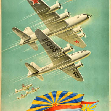 Original vintage propaganda poster - Слава могучей советской авиации! Glory to the mighty Soviet aviation - featuring a dynamic image of jet and propeller air force and commercial passenger planes marked with red Soviet stars on their wings, one marked CCCP Л1363 / CCCP L1363, flying against a pale blue sky background, military and civil aviation flags below with the text in bold letters along the bottom margin. Good condition, restored tears, repaired creasing, staining, backed on linen, pinholes in linen.