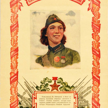 Original vintage Soviet World War Two propaganda poster - Glory to the heroes of the Patriotic War Komsomol member V. Lebedeva in the battle for the homeland showed examples of courage and bravery She managed to master four types of weapons, in addition to her speciality as an orderly She was awarded a military order - featuring an image of a smiling young lady wearing a medal on her military uniform next to a Lenin badge with a Soviet star on her hat, the title in a red ribbon banner above and the description below surrounded by different guns and weapons around a green wreath with a red star medal and hammer and sickle emblem, all set within a decorative red shaded oak leaf and ribbon frame border. Good condition, creasing, tears, minor staining, small paper losses.