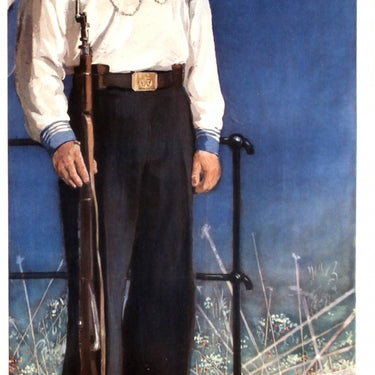 Original vintage Soviet propaganda poster: Glory to the Soviet Navy Sailors! Great image depicting a Soviet sailor in uniform standing under a large Soviet Naval flag (in white and blue featuring a red star and hammer and sickle) on the deck of a ship and holding a rifle gun with warships visible in the distance and the night sky illuminated with lights and fireworks over the sea with the text below in stylised white letters against a red background. Very good condition, faint creases in top and right margins.