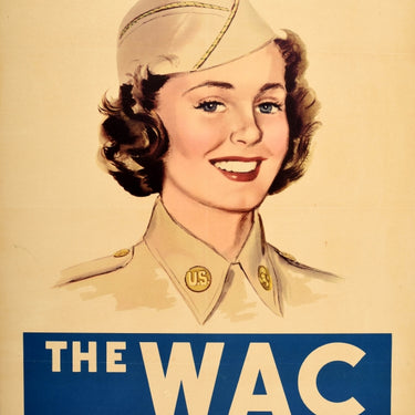 Original vintage World War Two recruitment poster - Good Soldier The WAC Women's Army Corps Apply at US Army Recruiting Station or ask your local Postmaster. Great design depicting a smiling lady in military uniform with the text in red above and rest of the information in blue and white below. Good condition, restored pinholes, restored folds, small restored paper loss on right edge, restored tears, staining, backed on linen.