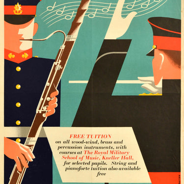 Original vintage British Army recruitment poster: ...Music wherever you go Men and boys - fulfil your musical ambition in the Regular Army Free tuition on all woodwind, brass and percussion instruments with courses at The Royal Military School of Music Kneller Hall for selected pupils. String and pianoforte tuition also available for free - featuring a colourful stylised design depicting two men in uniform on a pale blue background, one playing a bassoon and the other conducting with the musical notes floating below the slogan above, the main text and information on a music stand below. The Royal Military School of Music RMSM (founded 1857) was based at the historic Kneller Hall mansion house in Twickenham until 2021. Prepared for the War Office by the Central Office of Information. Printed for H.M. Stationery Office by Jordison and Co. Ltd. Good condition, folds, tears, creasing, staining.