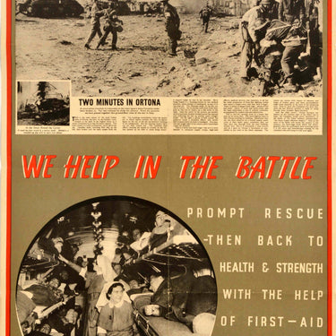 Original vintage World War Two poster - We Help In The Battle Prompt rescue then back to health & strength with the help of first aid dressings and medical supplies - featuring a black and white wartime photograph of the Battle of Ortona (20-28 December 1943) in the Italian coastal town showing soldiers and tanks with smoke from explosions in front of a building, the caption above - This reproduction from Picture Post illustrates the urgent need for medical supplies in front line fighting - and a news article below with the headline - Two minutes in Ortona A cameraman crouches in a doorway on the main square when Canadian tanks have broken in. For two minutes he clicks his camera. From his pictures we have pieced together this ground-floor view of the war in Italy - and the bold title text in red and white below next to a photo showing nurses in uniform tending to wounded soldiers in an underground tunnel shelter on the side. Issued by the Ministry of Supply. Printed for HM Stationery Office by Hubners Ltd. Good condition, folds, creasing, tears, pinholes, minor staining.