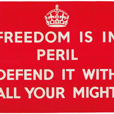 Extremely rare large size original vintage World War Two poster - Freedom Is In Peril Defend It With All Your Might - issued as one of a series of motivational Home Front publicity posters (the others reading Keep Calm And Carry On, Your Courage Your Cheerfulness Your Resolution Will Bring Us Victory and Don't Help The Enemy! Careless Talk May Give Away Vital Secrets), featuring a simple typography design with a Tudor crown above the bold white text on a red background. Printed on two large sheets, each measuring 102x152cm; due to paper shortages during the Second World War, only a handful of these posters were issued in this large size. Horizontal. Very good condition, folded as issued, minor tears and loss on fold lines.