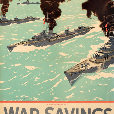 Original vintage World War Two home front poster issued to encourage people to buy war savings bonds and help win the war. Dramatic artwork by the notable British artist and illustrator Norman Wilkinson (1878-1971) depicting a military convoy of Royal Navy ships at sea flying flags with thick smoke rising from their funnels into the sky, the text below - War Savings Are Warships. Good condition, restored folds, restored tears, small restored paper losses on edges, minor staining, backed on linen.