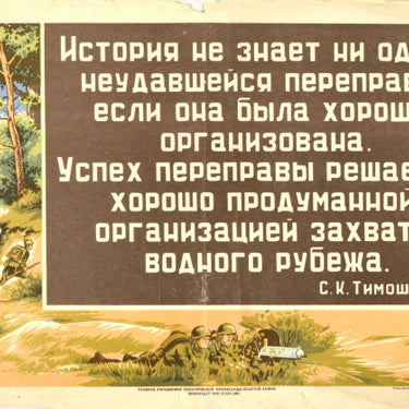 Original vintage World War Two poster featuring a quote by Semyon Konstantinovich Timoshenko (1895-1970) a Soviet military commander and Marshal of the Soviet Union - History does not know of a single failed crossing if it was well organised The success of the crossing is decided by a well thought out organisation of the capture of the water line - issued by the Main Directorate of Political Propaganda of the Red Army featuring the bold text in front of artwork showing military soldiers on a hill with a tank crossing a bridge over a river behind trees in the background. Horizontal. Fair condition, folds, creasing, staining, tears, paper losses on edges.