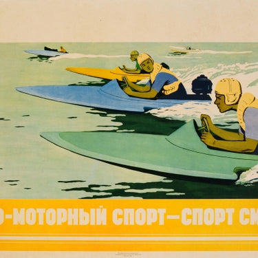 Original vintage Soviet sport poster: Water Motor Sports - Sport For The Brave. Dynamic illustration featuring three speed boat racing drivers wearing helmets in their speedboats competing in line and speeding towards the finish with two other boats in the background, the text below against a yellow border and the DOSAAF USSR logo above. Dosaaf (the Volunteer Society for Cooperation with the Army, Aviation and Fleet) was founded in 1927 for the development of paramilitary sports as a preparation for reserve armed forces. Horizontal. Fair condition, restored tears, loss on corners, light staining, colours faded, backed on linen.