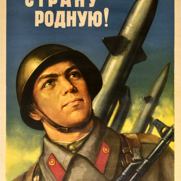 Original vintage USSR propaganda poster: We Protect The Motherland! / Бережём Страну Родную! Dynamic image featuring a Soviet soldier in a helmet and uniform holding a rifle gun and looking up to the sky in front of air force missiles below the text in white against the blue sky, a quote by the Soviet leader Nikita Khrushchev (1894-1971; First Secretary of the Central Committee of the Communist Party of the Soviet Union from 1953-1964) in yellow on a red background below: Modern equipment of the Soviet Army adequately provides for the defence of our country. Excellent condition, minor creasing.