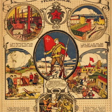 Original antique Donetsk Russian Civil War poster featuring colourful illustrations of industrial factories and transport by train and sea, farmers and people in a busy street scene, men handing out rifle guns to soldiers with an image of a soldier holding a gun and red RSFSR (Russian Soviet Federative Socialist Republic) flag standing over the river in the centre with the title above and text in scrolls next to the images reading - Why do we need the Donetsk Basin Coal and Iron 1. When the Donetsk Basin is ours, we will have coal, then all our factories and plants will start working 2. When we have coal, trains and steamboats will deliver grain to the starving cities and villages 3. When the Donetsk Basin is ours, we will have iron, then the peasant will have something to repair his plough and make a wheel, he will have a sickle, a scythe, a shovel, an axe and agricultural tools and equipment 4. When we have coal and iron, factories and plants will work, we will have bread, fabric, shoes and all sorts of goods - all that the White Guards who have seized the Donetsk Basin are depriving us of The Donetsk pool should be ours! Red Army men to arms! Workers and peasants to arms! Let us crush the gangs of the tsarist General Denikin who, in order to please the kulaks and landowners, wants to starve the revolutionary peasants and workers. Good condition, restored tears, small restored paper losses, browning, minor staining, backed on linen.