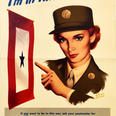 Original vintage World War Two recruitment poster - I'm in this war too! If you want to be in this war, ask your postmaster for the free post card that will bring you information on the Women's Army Corps. Army of the United States - featuring an elegant young lady in a military uniform pointing to a service star pennant on a banner. The Women's Army Auxiliary Corps WAAC was founded in 1942 as a branch of the United States Army and renamed the Women's Army Corps WAC in 1943 serving in WWII, the Korean War and Vietnam War before being disbanded in 1978 and integrated with the US Army male units. Good condition, folds, staining, pinholes.
