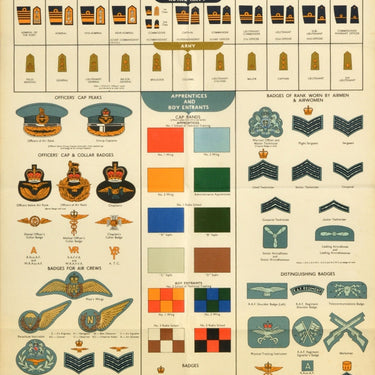 Original vintage military insignia poster - Women's Royal Air Force Auxiliary and Reserve Air Forces Badges of Rank and Distinguishing Badges - featuring a chart showing the Royal Air Force, Royal Navy and Army epaulettes (shoulder insignia), officers' cap peaks, cap and collar badges, badges for air crews, badges of rank worn by airmen and airwomen, cap bands and badges of apprentices and boy entrants, and distinguishing badges including medical and dental, physical training, telecommunications, signallers, marksmen and musicians. Good condition, folds, tears, minor creasing, staining, foxing.