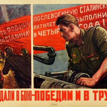 Original vintage Soviet propaganda poster promoting hard work and fruitful results - We were victorious in battle We will be victorious in labour / Побеждали в бою Победим и в труде! - featuring a dynamic illustration of two images, one depicting soldiers in uniform advancing during war with a red banner in front of searchlights on the night sky background reading - For the Motherland For Stalin - and the other depicting a man working on machinery with his military shirt sleeves rolled up and a red banner behind him extending across from the battle scene reading - We will fulfil the post-war Stalin five year plan in four years! Horizontal. Good condition, restored folds, restored paper losses, restored tears, restored creasing, staining, backed on linen.