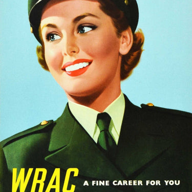 Original vintage British Army military recruitment poster for the Women's Royal Army Corps (1949-1992): WRAC A Fine Career For You featuring a smiling young lady in a green uniform against a pale blue sky background, the title and rest of the text below - For full information apply to any Army Recruiting Office or write direct to the War Office (MP6) London SW1. Very good condition, bumps on edges, punched holes on top edge, ink stamp on reverse.