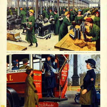 Original vintage World War One educational poster - 1915 Women in War-Time - featuring two illustrations with captions, the one above depicting ladies in green uniform and headscarves working at a munitions factory - Filling shells with explosives - and below showing a postal worker wearing a blue GPO General Post Office uniform walking past a red double decker bus with a conductress at the back waiting for a member of the Women's Army Auxiliary Corps (WAAC) to board - A Postwoman a Bus Conductress and a member of the W.A.A.C. This poster would have been on display and used as a teaching aid at schools for history lessons. The Women's Army Auxiliary Corps WAAC was set up in 1917 to help with administrative and auxiliary work on a voluntary basis during WWI to free men for the front line and help on the home front; the WAAC continued in France after the war before being disbanded in 1921; many then joined the new Auxiliary Territorial Service ATS (1938-1949) during World War Two. Fair condition, pinholes, tape marks, staining, small paper loss.